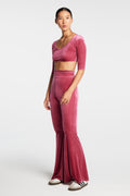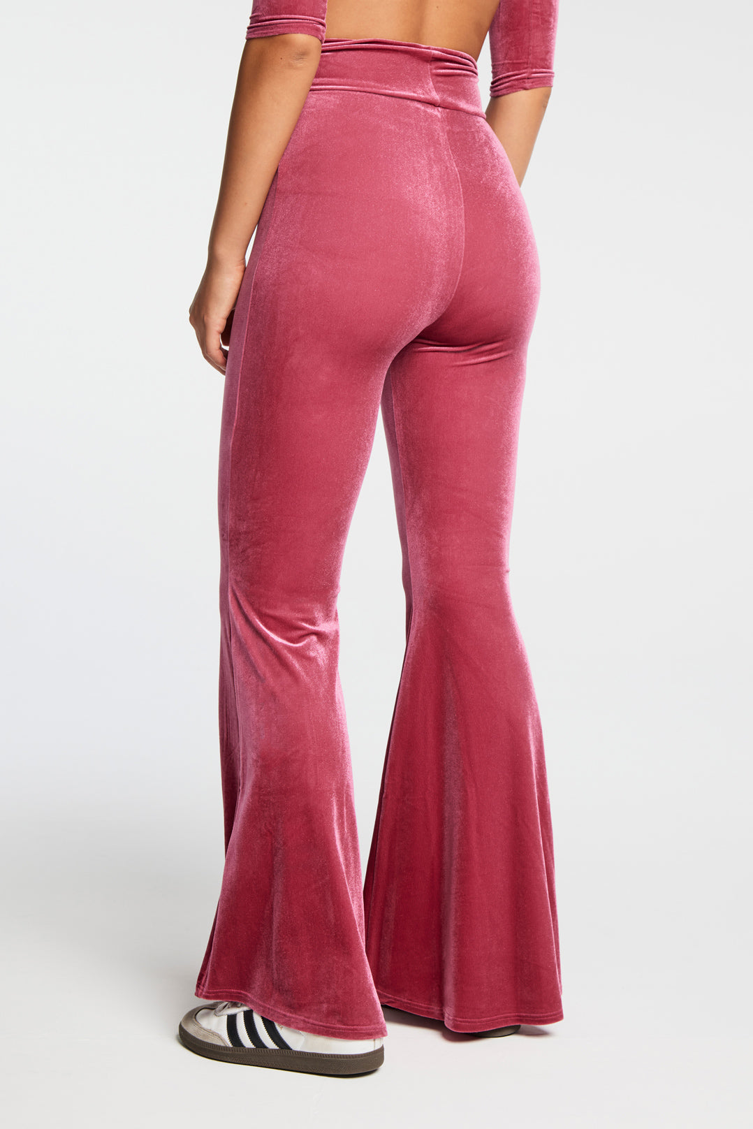 Pantalone a zampa in velluto liscio elasticizzato dall'aspetto lucido e brillante esternamente comodo e avvolgente , adatto con sneakers oppure con i tacchi.