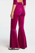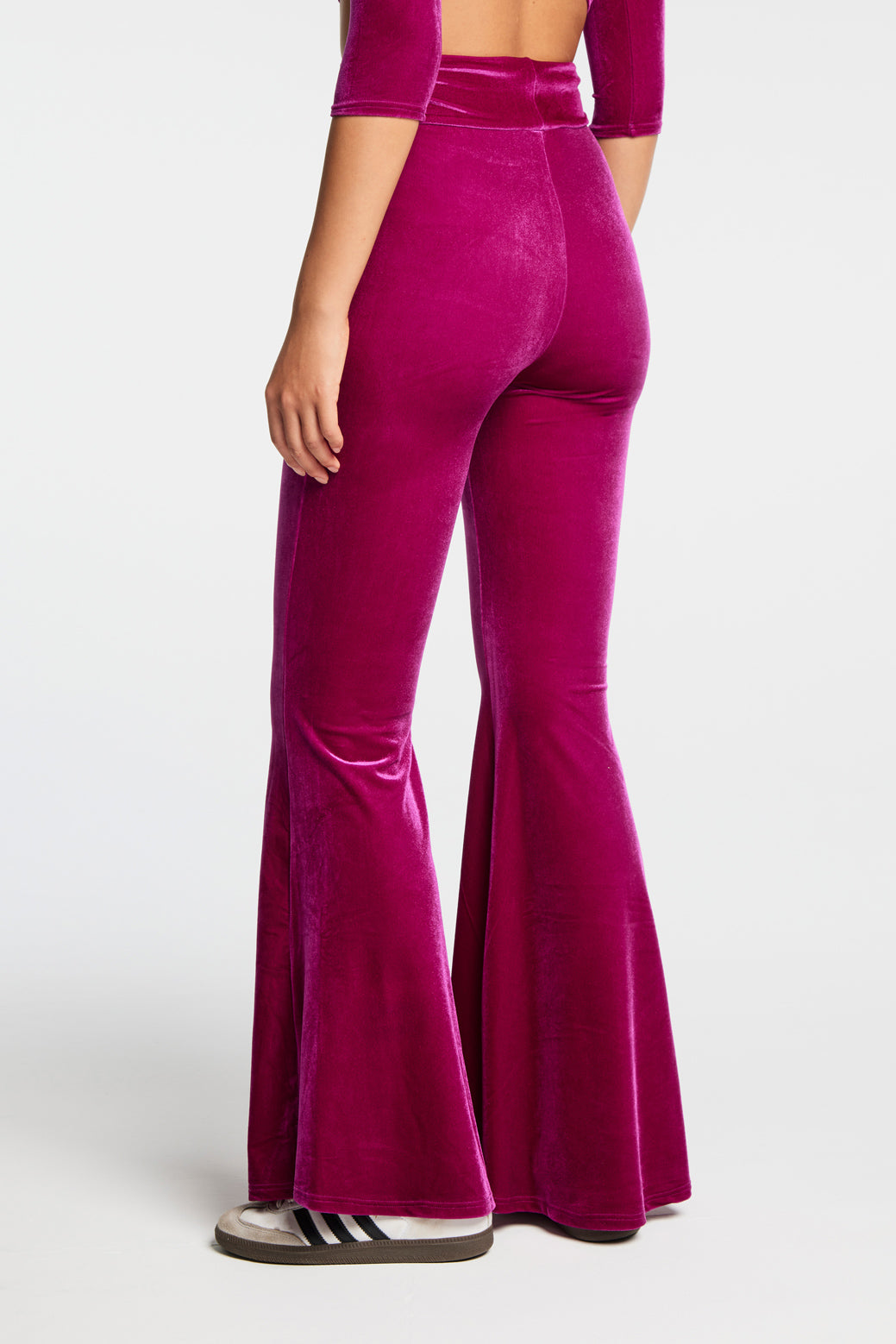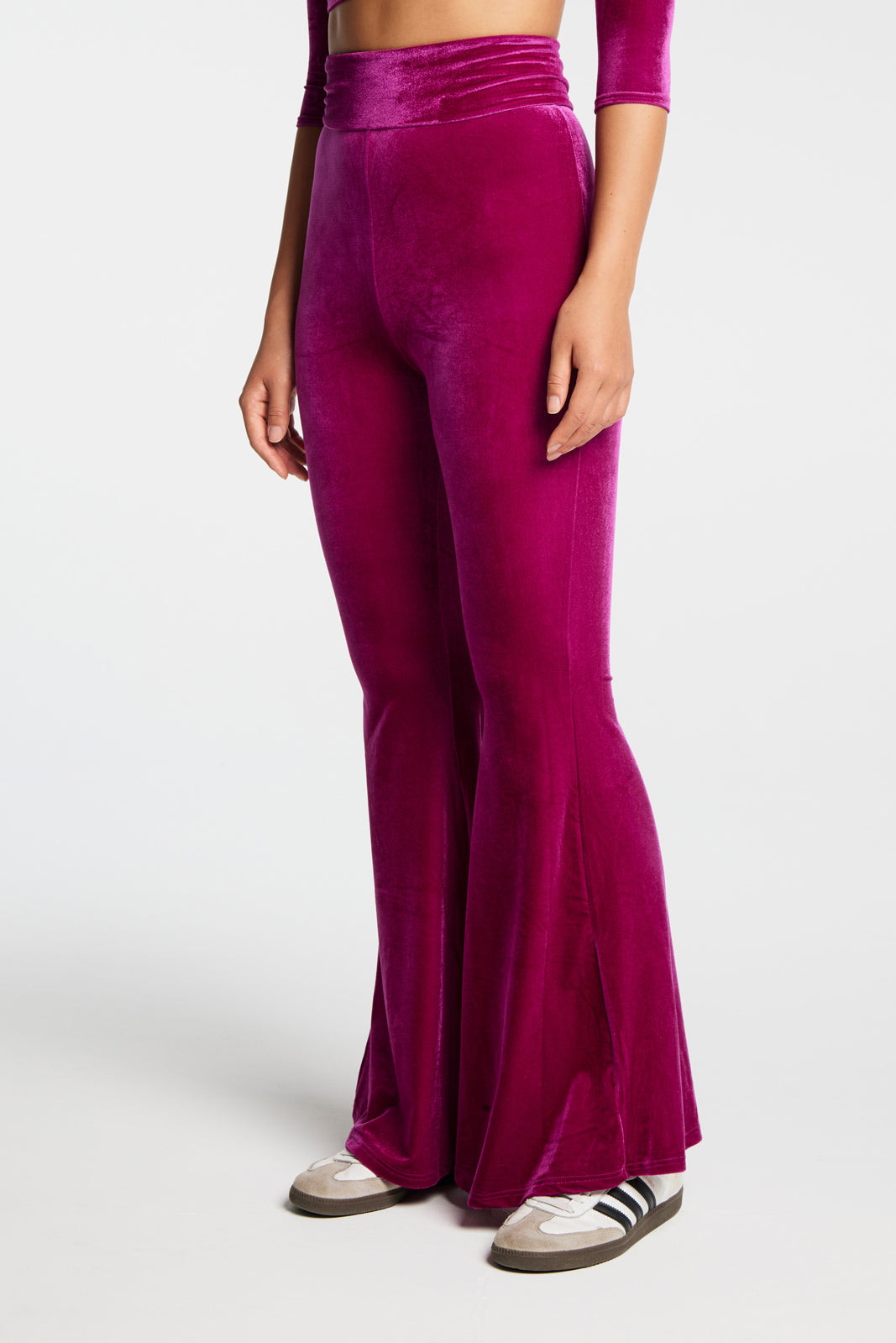 Pantalone a zampa in velluto liscio elasticizzato dall'aspetto lucido e brillante esternamente comodo e avvolgente , adatto con sneakers oppure con i tacchi.