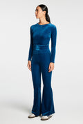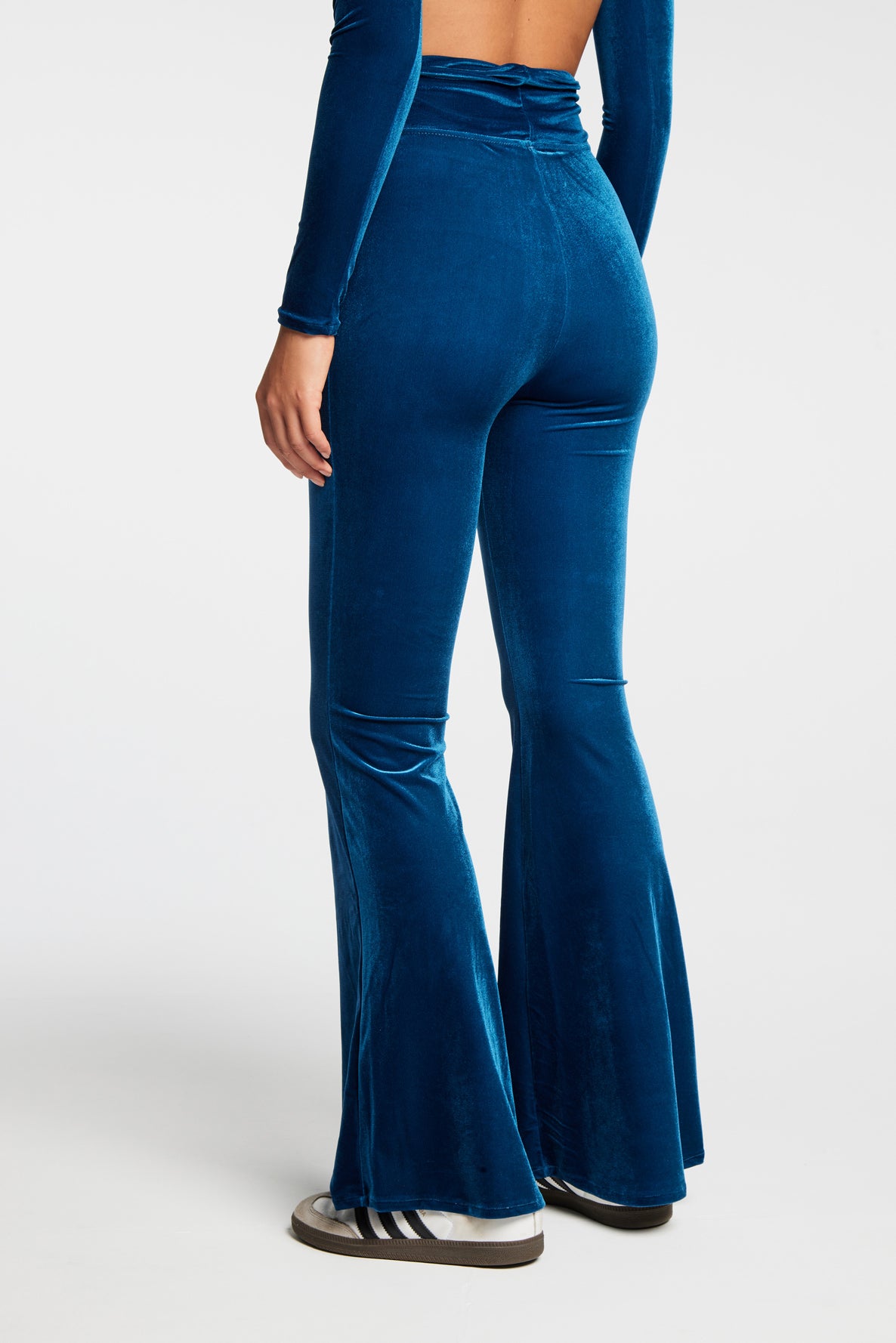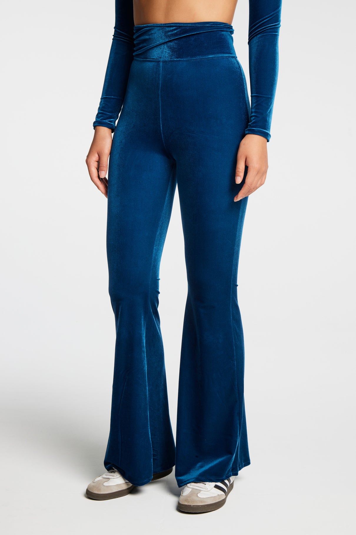 Pantalone a zampa in velluto liscio elasticizzato dall'aspetto lucido e brillante esternamente comodo e avvolgente, adatto con sneakers oppure con i tacchi.