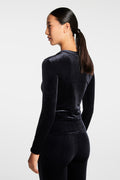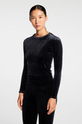 maglia corta maniche lunghe che interpreta alla perfezione uno street style giovane e alla moda grazie al tessuto di velluto liscio elasticizzato dall' effetto cangiante e raffinato