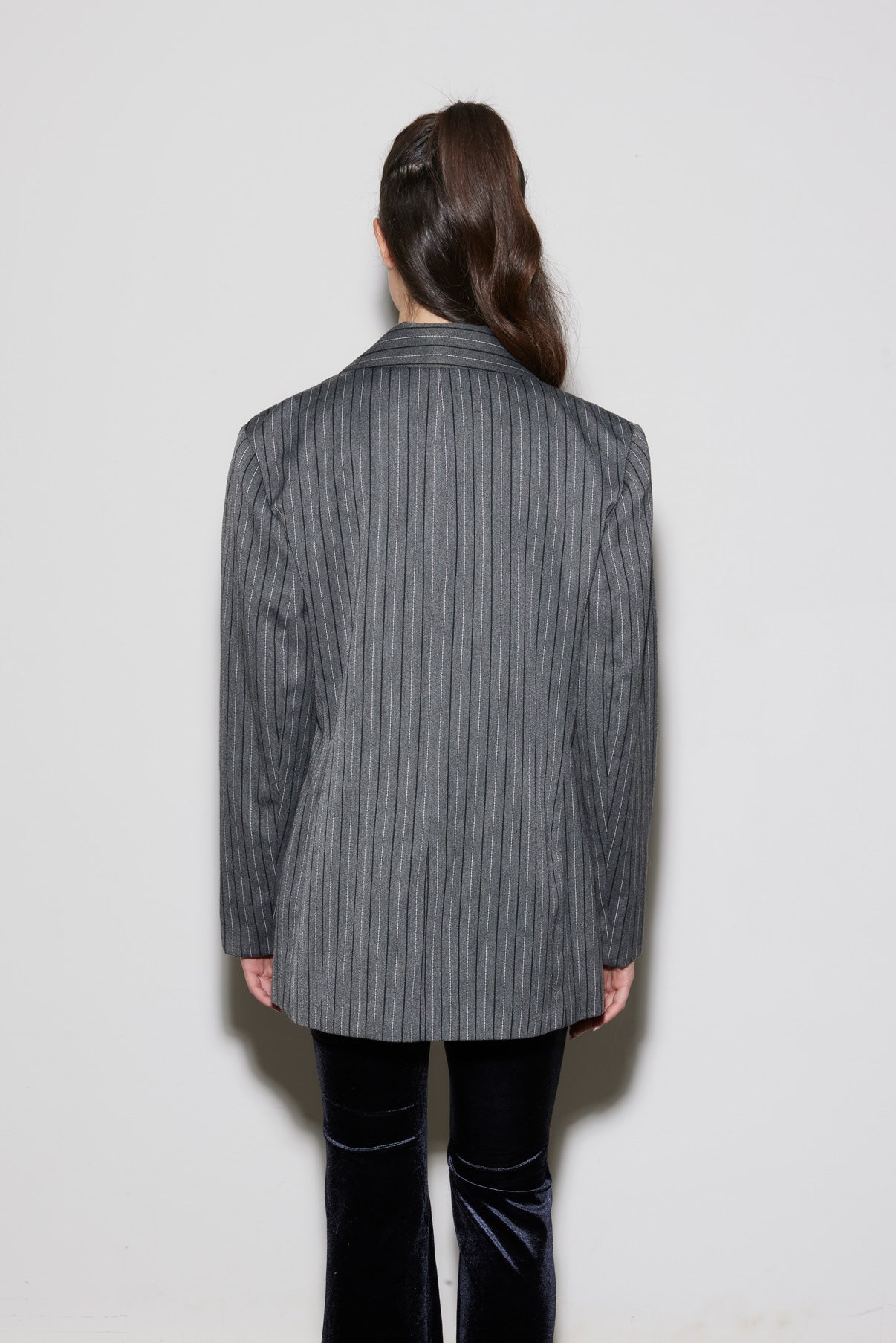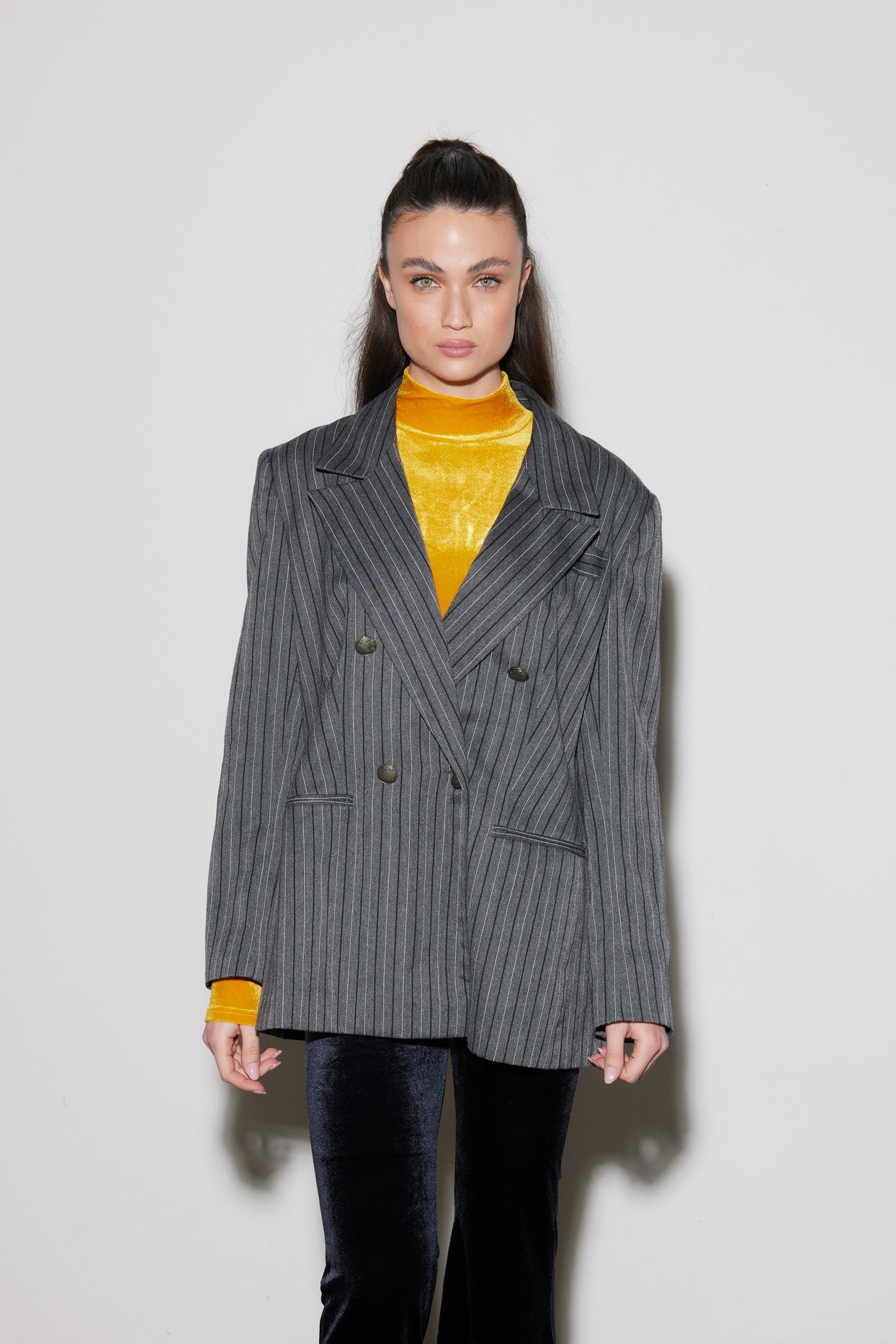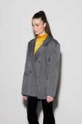 Giacca doppiopetto dallo stile classico, con righe verticali, ampi revere e chiusura a bottoni. Perfetta per un look raffinato e senza tempo.