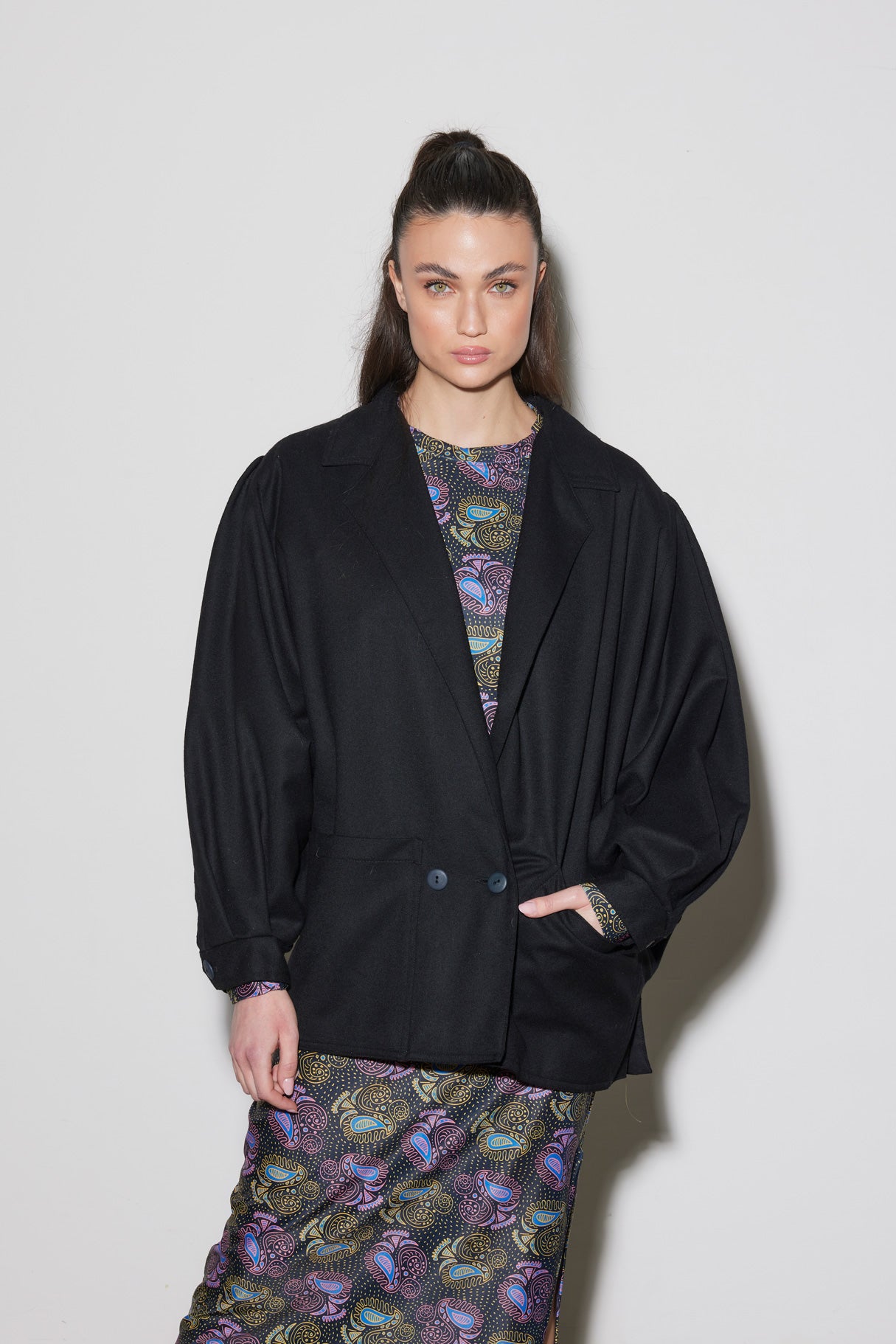 Giacca dal taglio oversize con maniche a sbuffo e chiusura a doppio bottone. Perfetta per un look sofisticato e versatile, da abbinare sia a outfit formali che casual chic.