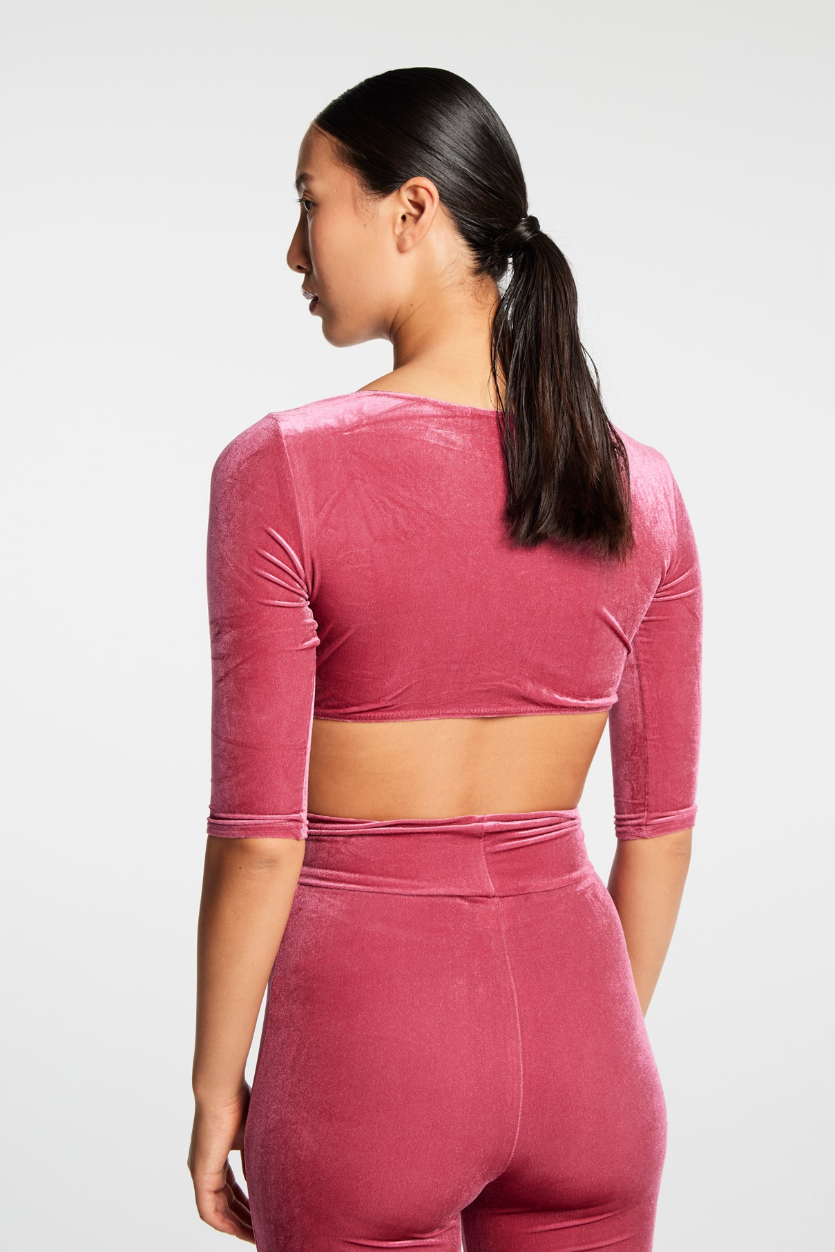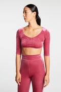 top dal taglio crop manichetre quarti che interpreta alla perfezione uno street style giovane e alla moda grazie al tessuto di velluto liscio elasticizzato dall' effetto cangiante e raffinato