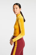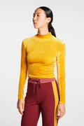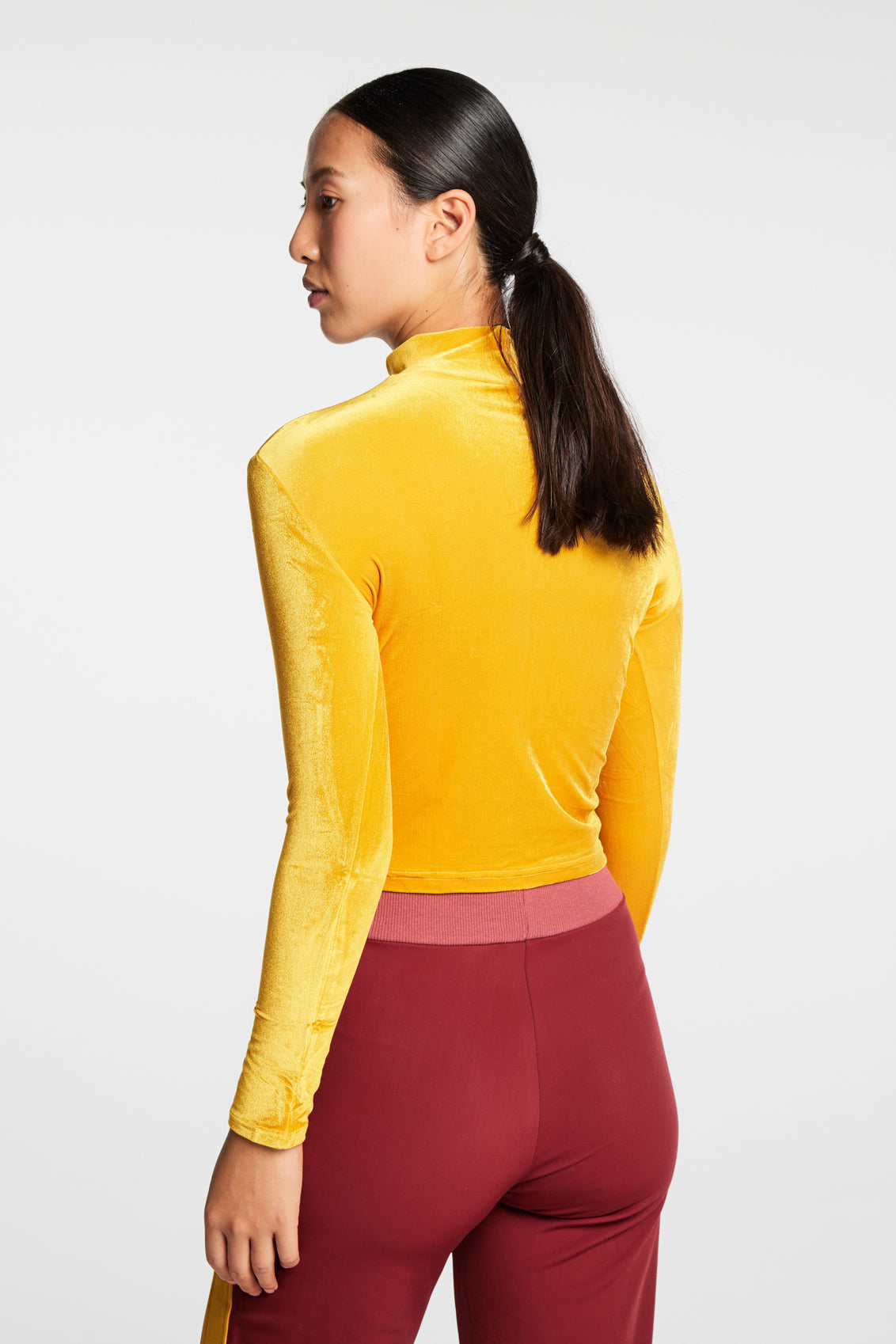 Maglia corta maniche lunghe e collo alto che interpreta alla perfezione uno street style giovane e alla moda grazie al tessuto di velluto liscio elasticizzato dall'effetto cangiante e raffinato.