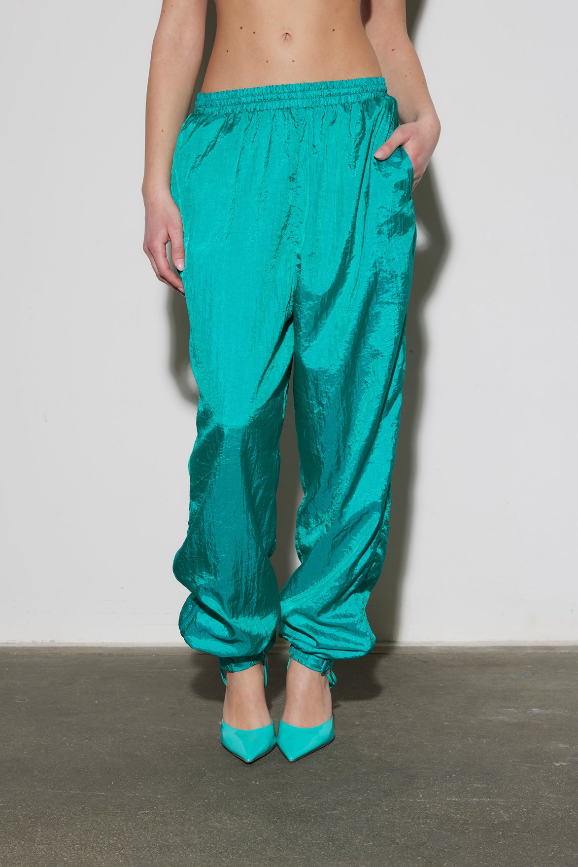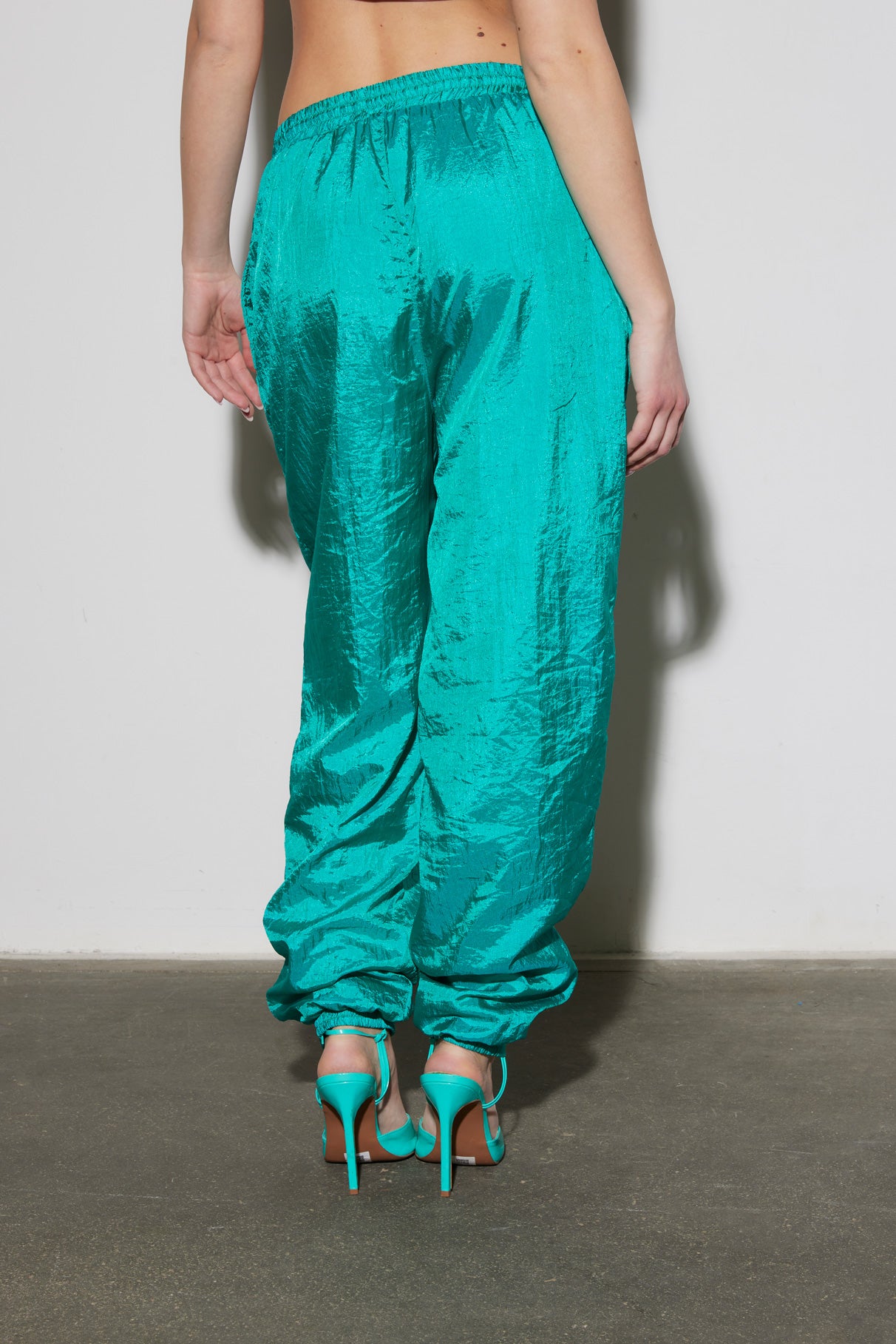 Pantalone sportivo vintage in tessuto satinato leggero e brillante. Vita elasticizzata e polsini alle caviglie per un fit comodo e versatile. Perfetto per look streetwear o casual.