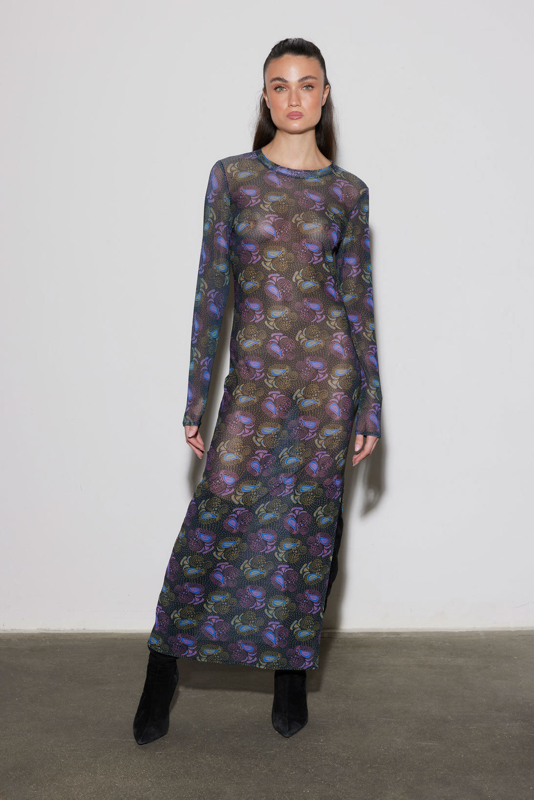Abito lungo in tulle stampato, taglia unica, con maniche lunghe e fantasia paisley nei toni scuri. Leggero e fluido, ideale da stratificare. Lo spacco laterale aggiunge un tocco di eleganza e movimento. composizione 100%pl